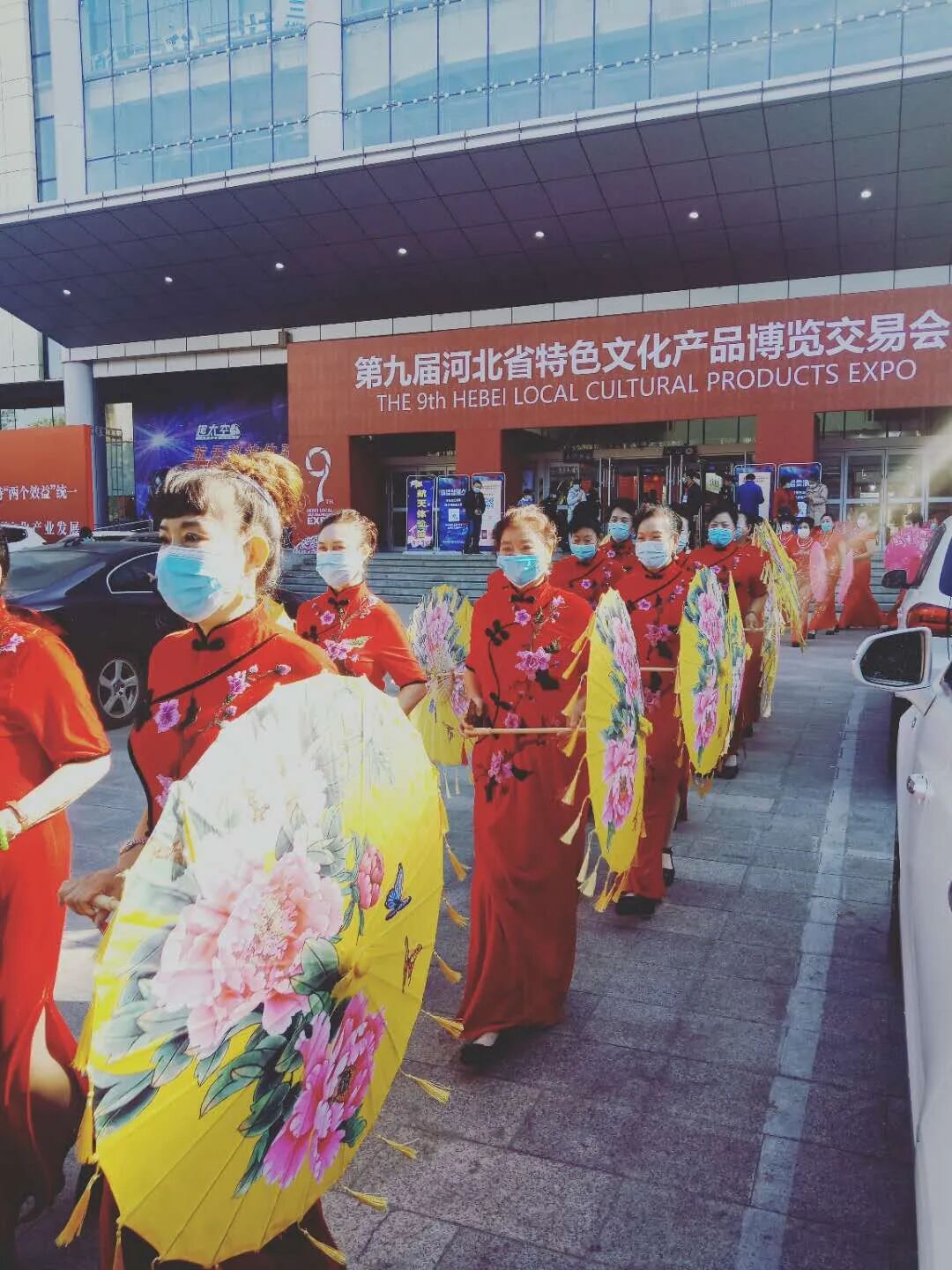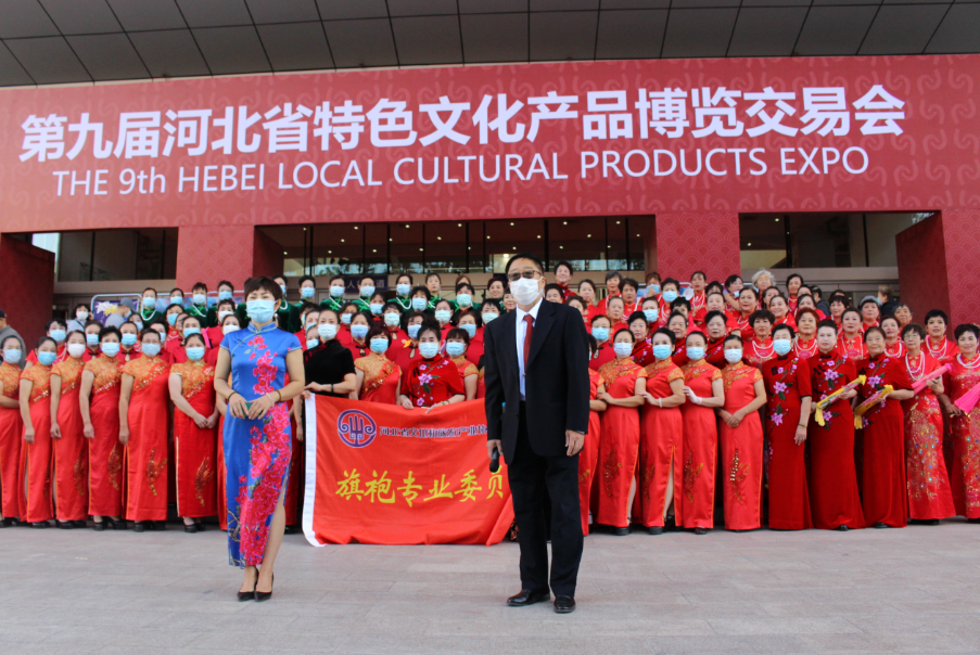 河北省文化和旅游产业协会旗袍专业委员会成员在场馆门口合影留念。