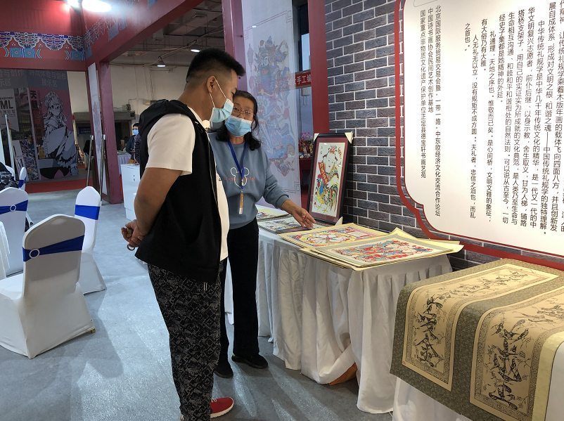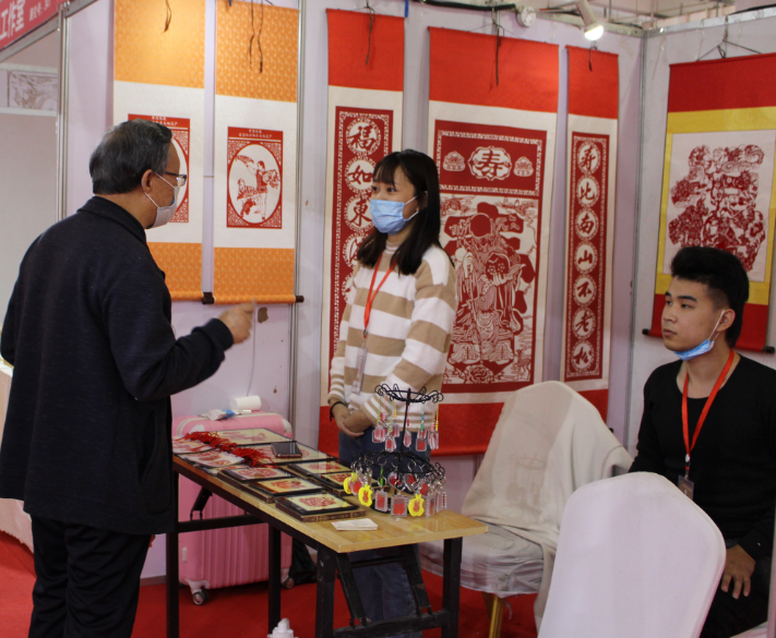 井陉剪纸展位的工作人员与观众进行交流。