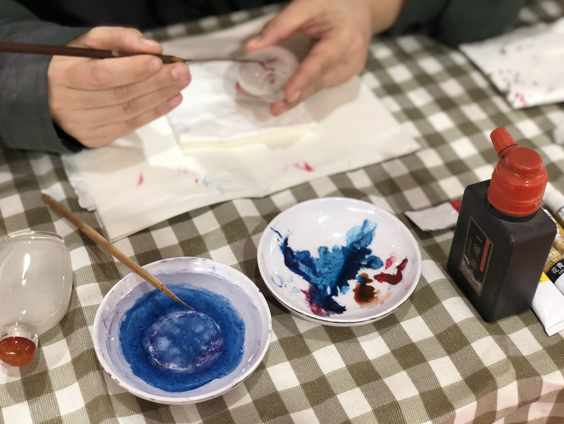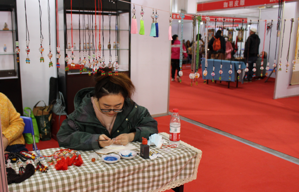 黄红艳内画展位正在制作内画的工作人员。