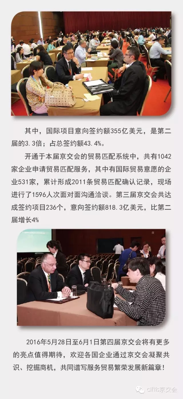 二是形式方面,更加注重创新与互动,将结合“互联网+”特别是移动互联带来的产业融合新业态及服务消费新方式等,展示最新服务产品,开展技术、版权等现场拍卖交易、跨境电商交易等,突出现场交易与互动。