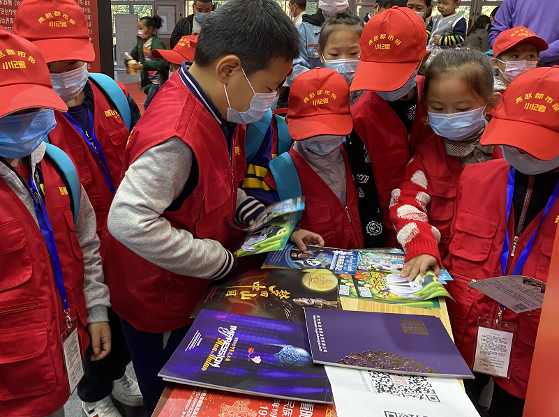 在河北演艺集团展区前兴致勃勃地翻阅展览手册。