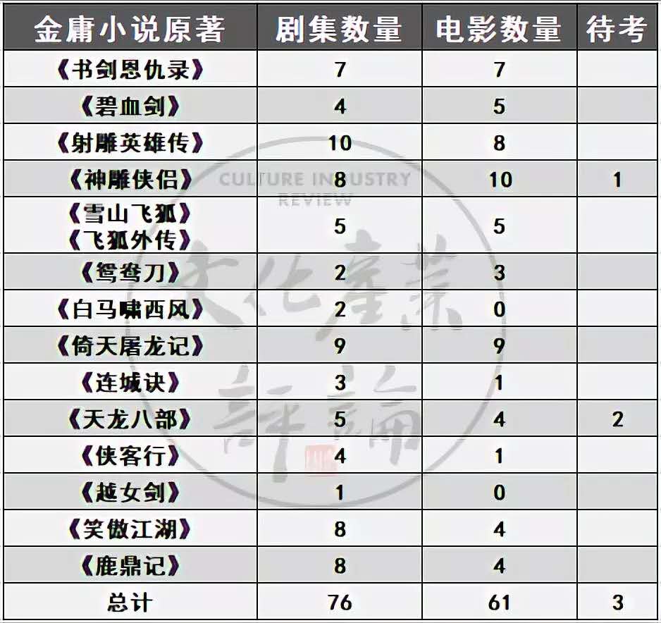 港台地区改编的金庸影视剧,给剧方带来了巨大的红利。2003年苏有朋版《倚天屠龙记》引进内地之后,最高收视率达26%,一时风头无两。而华谊在2005年开始布局电视剧业务,此后几年,金庸武侠剧一度撑起其电视剧业务的半壁江山,仅一部《鹿鼎记》便获得4403万元的销售收入。不仅是影视剧,金庸IP还衍生了100多款游戏,产值超千亿。畅游于2007年推出的网游《天龙八部》,上线1年后便占据搜狐在线游戏15亿元总收入的95%。毋庸置疑,金庸是新时期的一个经济现象。